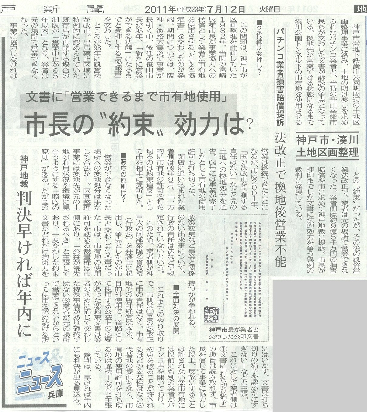 神戸市営地下鉄湊川公園駅の出入口設置工事に伴う神戸市の土地区画整理事業で、店舗を一時移転させたパチンコ業者が、事業中に風俗営業法が改正されたため、営業が再開できなくなった。業者は「事業に協力しなければ営業は継続できた」として9億5000万円の損害賠償を神戸市に求め、神戸地裁に提訴。神戸市は「国の政策を予測する責任はない」と争う姿勢だ。
