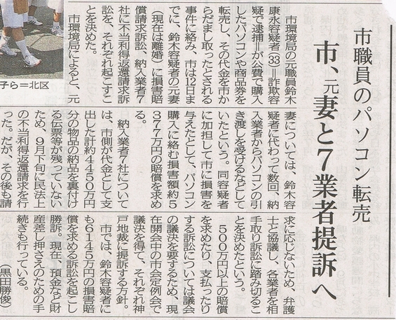 事件をめぐっては匿名の通報で2010/04、鈴木によるパソコンの不正購入が発覚。鈴木は2010/06に懲戒免職になった。