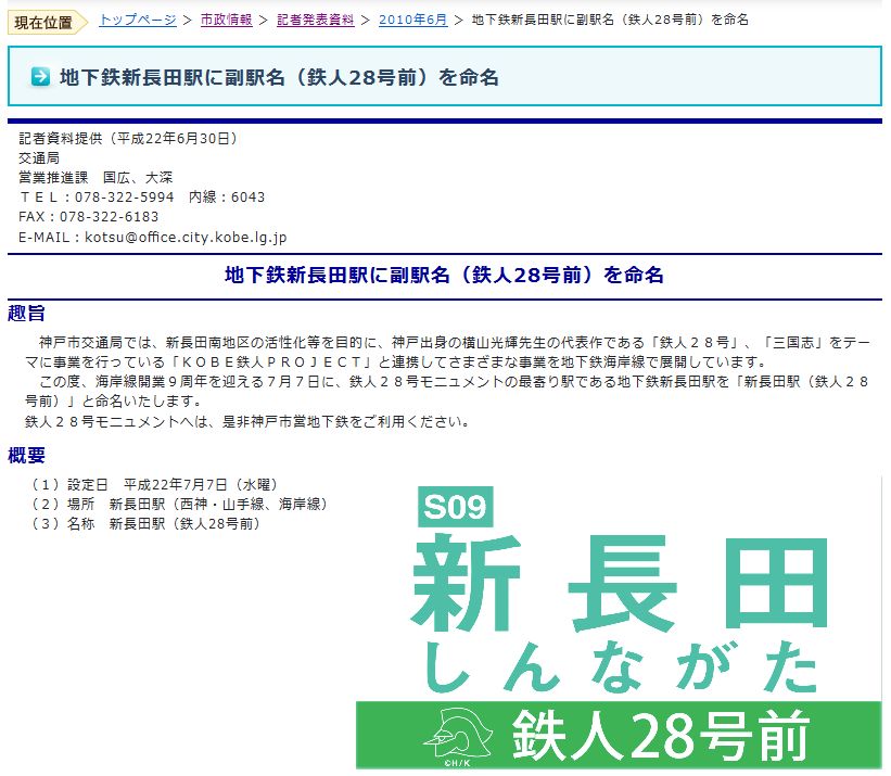 神戸市営地下鉄 新長田駅(西神山手線、海岸線)に、「鉄人28号前」という副駅名が付きます。神戸市記者発表